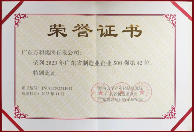 11月21日,2023廣東省制造業(yè)500強(qiáng)峰會(huì)在佛山舉行,會(huì)上發(fā)布了《2023年廣東制造業(yè)500強(qiáng)企業(yè)研究報(bào)告》,正式揭曉2023廣東省制造業(yè)500強(qiáng)榜單,廣東萬和集團(tuán)有限公司進(jìn)入第一梯隊(duì),位列榜單第42位。
