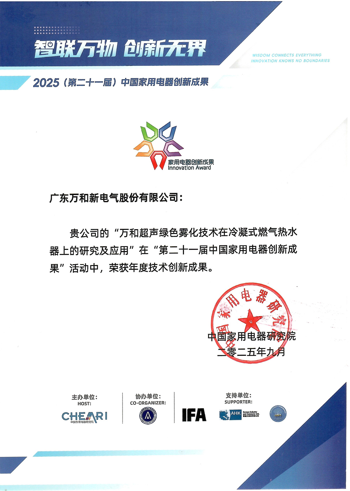 為匯聚全球智慧、激發創新活力,由中國家用電器研究院主辦的第二十一屆(2025)中國家用電器創新成果發布盛典在德國柏林IFA展上召開。本次盛典以“智聯萬物 創新無界”為主題,集中展示了中國家電行業在智能化、綠色化、場景化等領域的最新突破。其中,廣東萬和新電氣股份有限公司的“超聲綠色霧化技術在冷凝式燃氣熱水器上的研究及應用”,憑借對行業痛點的顛覆性解決能力與標桿性價值,成功斬獲“年度技術創新”榮譽稱號。這一榮譽的背后,不僅是一項技術成果的高光亮相,更是中國家電企業從產品輸出向技術標準輸出的里程碑事件。